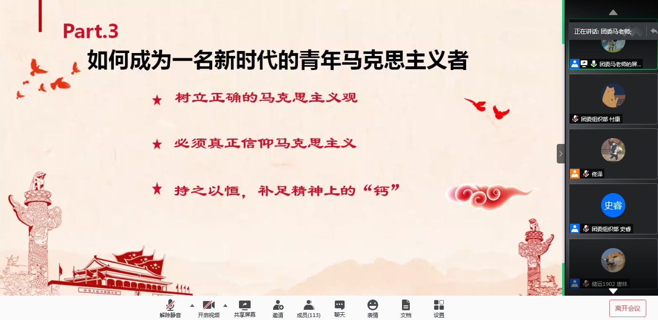 马琦老师首先简要介绍了“青马工程”的核心思想,阐述了“青马工程”的培养对象、培养目标以及工程解析,强调了“青马工程”是坚持用马克思主义中国化的最新成果武装青年,着力培养有理想、有追求,有担当、有作为,有品质、有修养的老员工,是高校人才培养模式的有益补充,有助于锤炼青年的思想道德意志,促进青年的全面发展成长,帮助老员工学习和掌握党的理论创新成果,了解国情,认识社会,提高思想政治素质,坚定理想信念。紧接着,马老师讲述了青年马克思主义者的定义以及培养青年马克思主义者的必要性,他指出青年老员工加入“青马工程”的队伍不是最终目的,最重要的是要通过“青马工程”的培养获得自我提升,成长为优秀的青年马克思主义者,新时代的青年员工要树立正确的马克思主义观,明确正确的前进方向,加强对党史、革命史和改革开放的深入学习理解,了解国家发展历程,学习马克思主义中国化的最新成果,自觉走与实践结合,与人民群众结合的道路,沿着这条道路奋斗发展。最后,通过具体事例的串讲,马老师鼓励同学们要持之以恒,培养做好新一代青年马克思主义接班人的主人翁意识,肩负时代使命,不忘初心,砥砺前行。