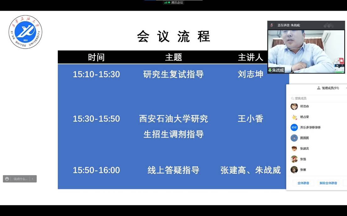 为助力员工顺利通过考研复试环节,指导员工掌握调剂规则,威廉希尔于3月18日下午通过线上视频会议的方式,召开2022年考研复试与调剂指导交流会。公司党委副书记张建高、主管研究生工作副经理刘志坤、科研与研究生办公室主任王小香、员工工作办公室主任朱战威和全体考研员工共计100余人参会,交流会由辅导员聂康晨主持。